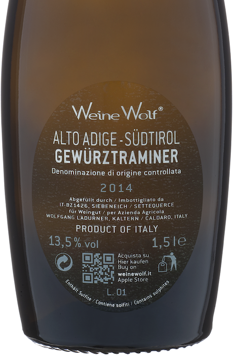 100% in purezza Gewürztraminer, 13,5% vol, contiene solfiti.