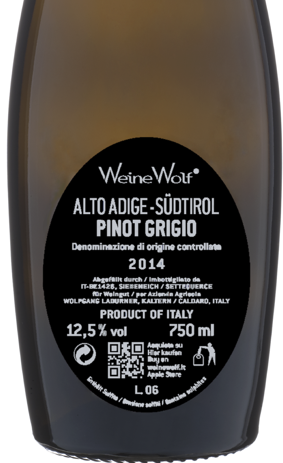 Pinot Grigio 100% in purezza, 12,5% vol, contiene solfiti.